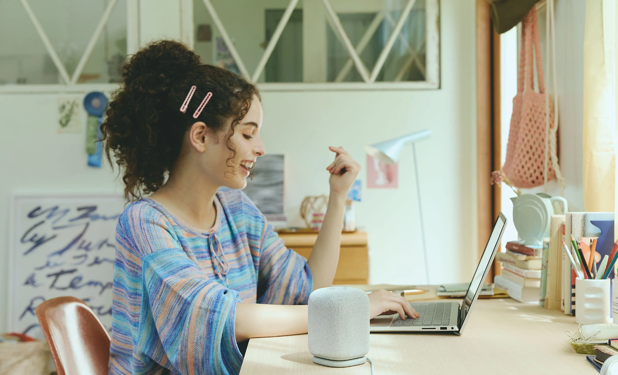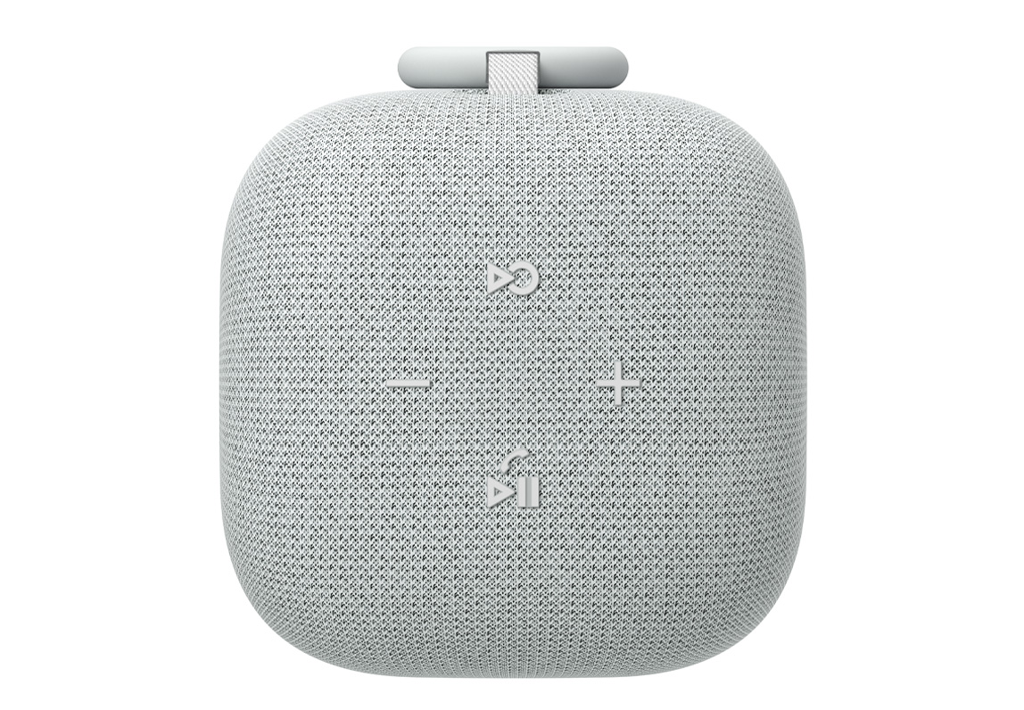 링크버즈 스피커는 심플한 원통형 디자인에 패브릭 소재로 감싸져 있어 따뜻하고 고급스러운 느낌을 줍니다. 색상은 블랙과 밝은 회색 두 가지, 저는 회색을 선택했어요. 모서리가 둥글어 귀엽고 어디에 두어도 인테리어를 해치지 않더라고요.
