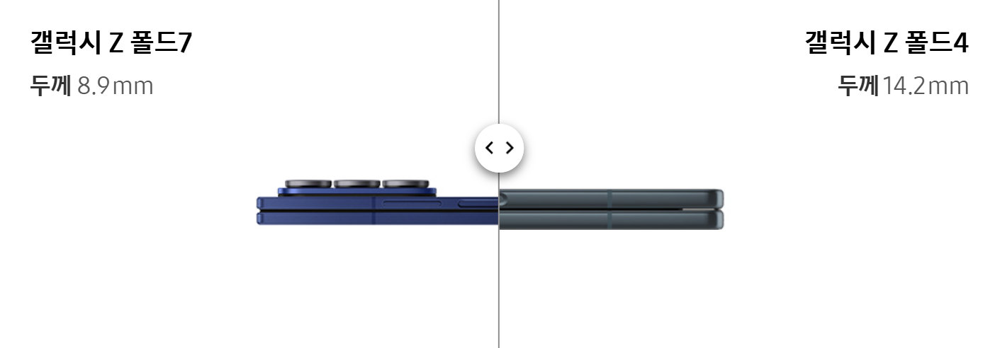 이번 폴드7은 전작 폴드6보다 훨씬 가벼워졌습니다. 무게는 기존 239g에서 215g으로 크게 줄어, 일반적인 스마트폰과 유사한 가벼움을 제공합니다. 두께도 접었을 때 8.9mm, 펼쳤을 때는 무려 4.2mm로 매우 슬림해졌습니다.