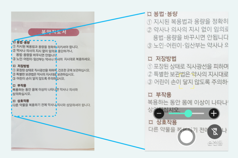 - 돋보기 기능: 약봉지나 작은 글자를 크게 확대해서 볼 수 있습니다.