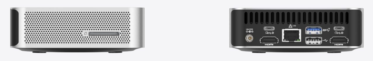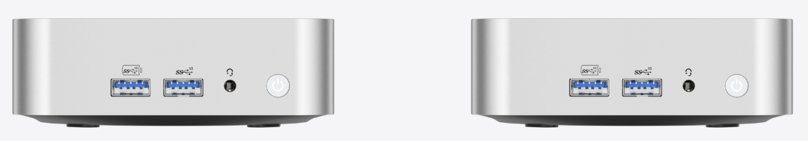 GEEKOM A6는 전체적으로 고급스러운 알루미늄 바디가 특징입니다. 마치 애플의 맥과 같은 감성을 느낄 수 있으며, 플라스틱 재질의 후면과 바닥면은 깔끔한 마감을 제공합니다. 본체 전면에는 두 개의 USB 3.2 Gen2 A 포트, 스테레오 헤드폰 잭, 전원 버튼이 있으며, 좌측면에 SD 카드 슬롯을 추가해 편의성을 높였습니다.