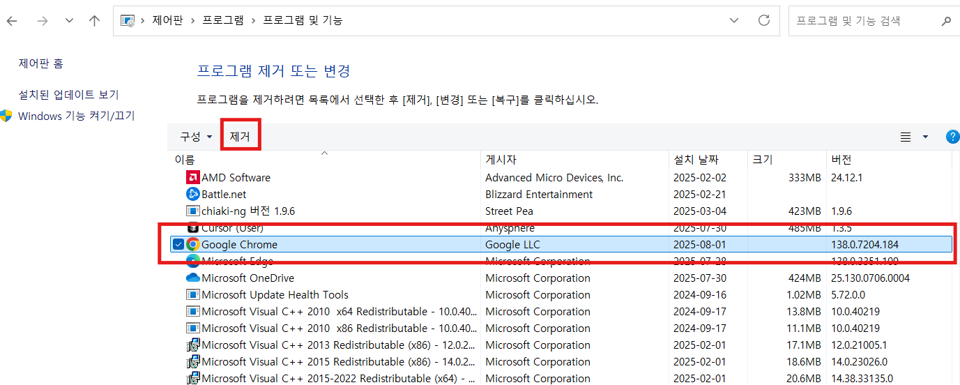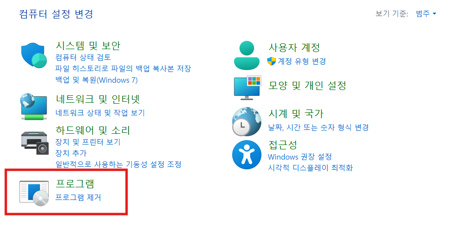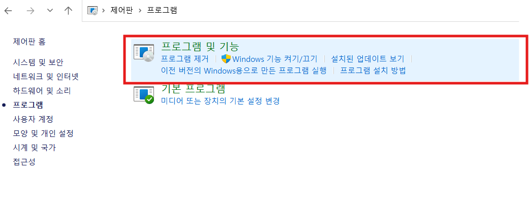 - 프로그램 및 기능 클릭 → 제거할 프로그램 선택 후
