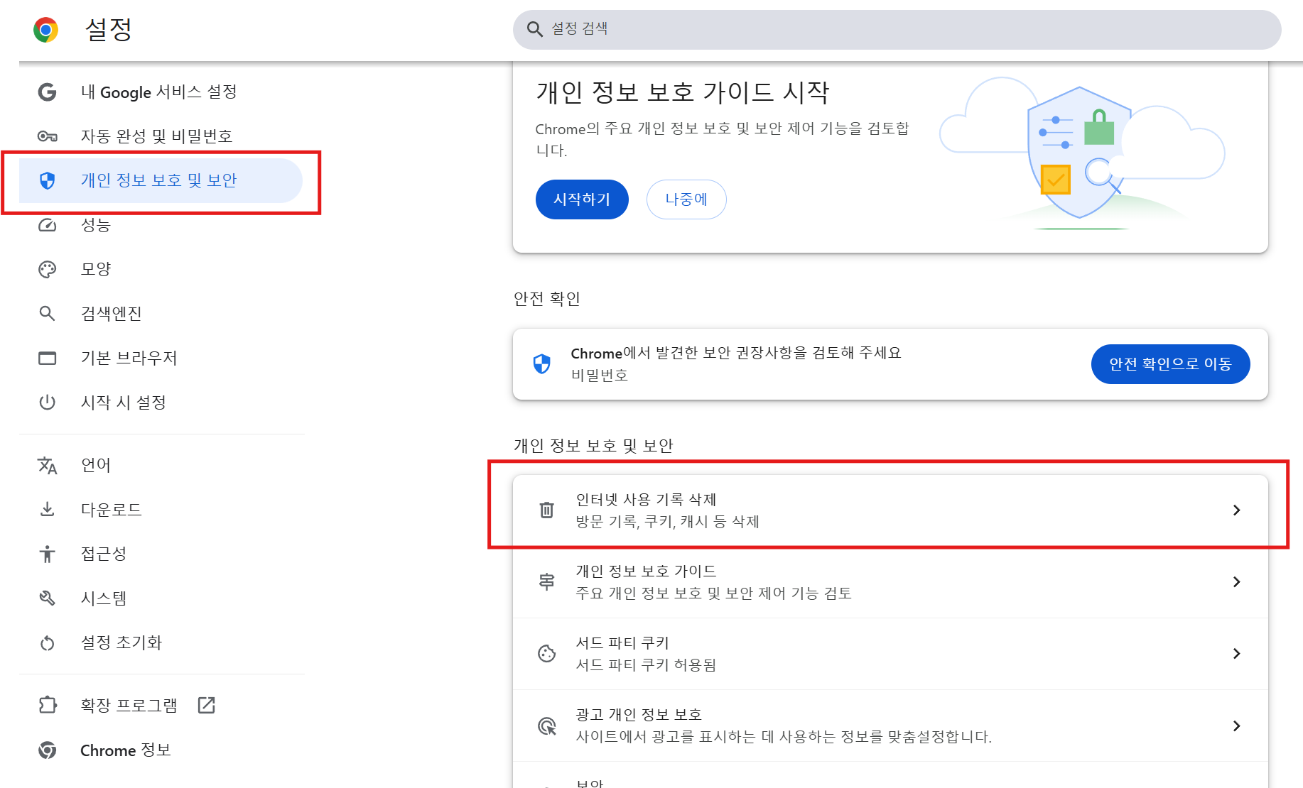 - 설정 → 개인 정보 및 보안 → 인터넷 사용 기록 삭제 선택