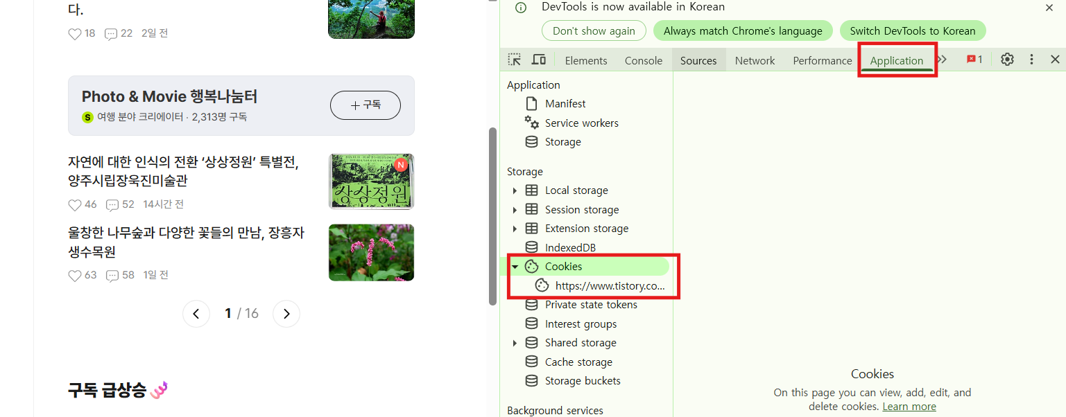 - Application 탭 → Cookies 항목 클릭