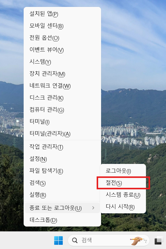 - Windows + X → '종료 또는 로그아웃' → '절전'