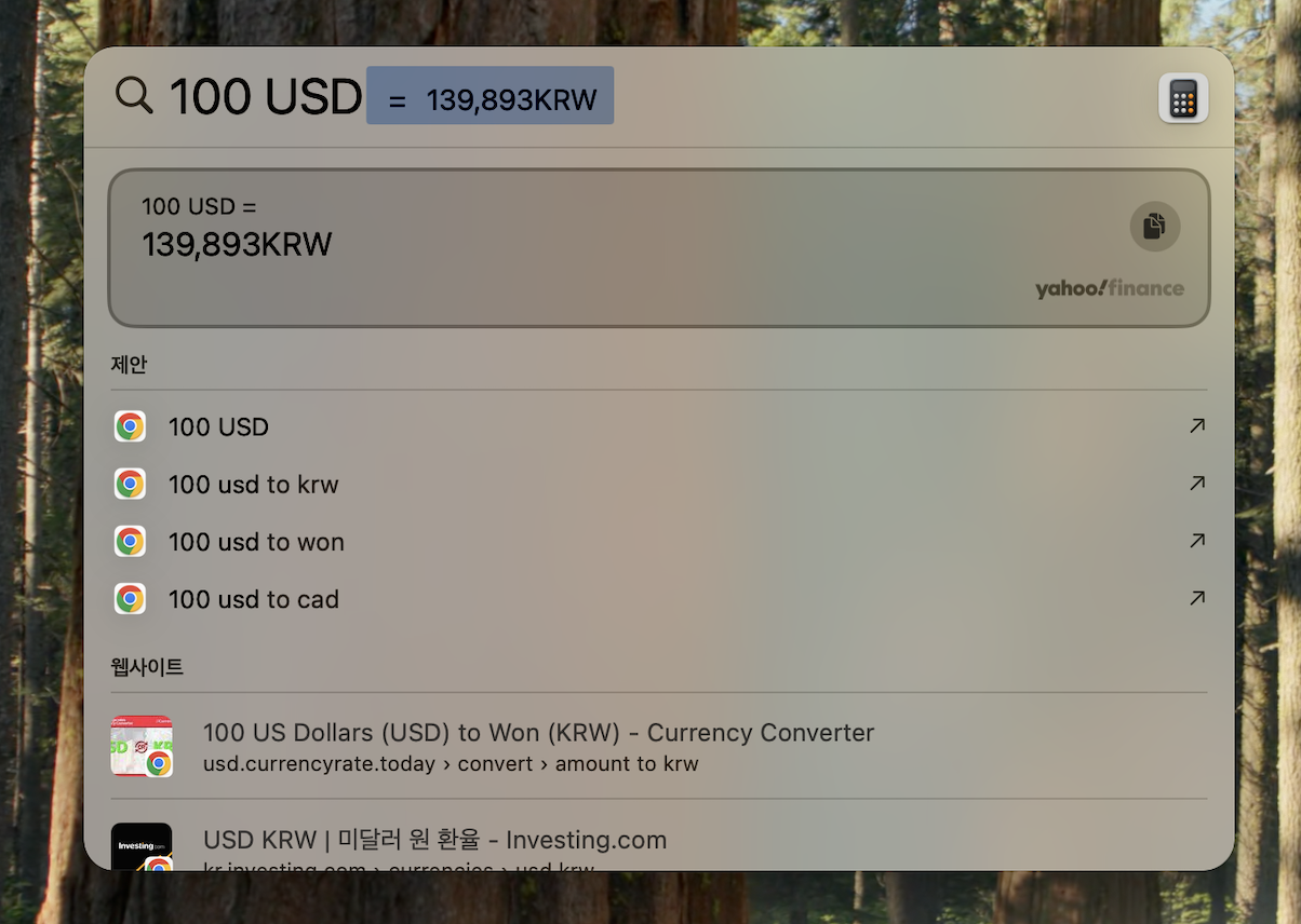 100 USD in KRW라고 입력하면 실시간 환율을 반영한 원화 금액이 나옵니다. - 사전 검색