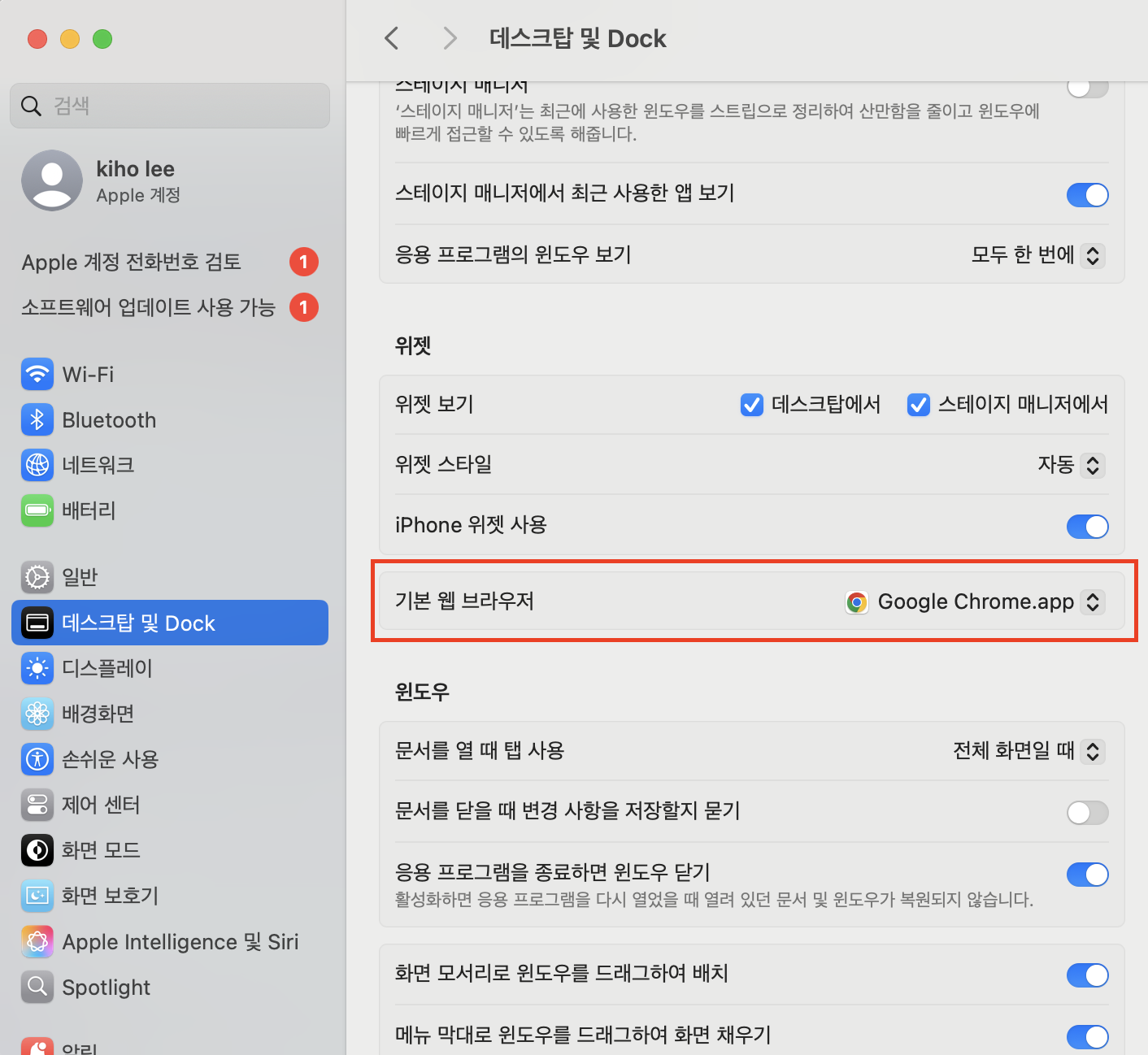 - 왼쪽 사이드바에서 데스크탑 및 Dock(Desktop & Dock) 선택