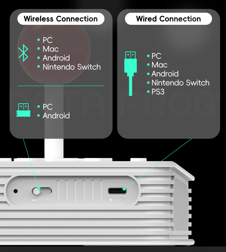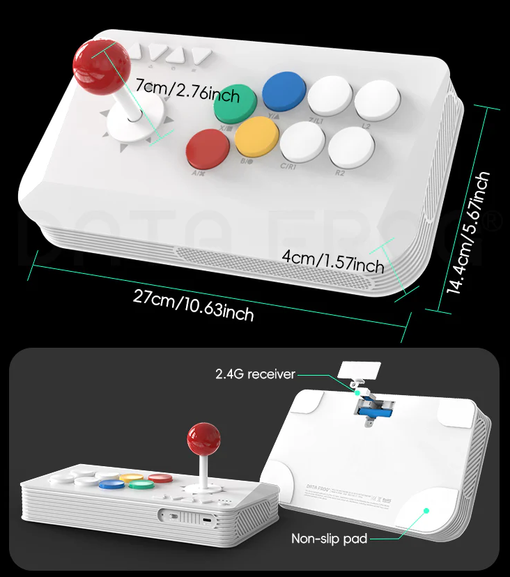 DATA FROG Y5A 아케이드 스틱은 키보드용 청축 스위치를 탑재해 경쾌한 키감, 무게 452g의 가벼운 휴대성, 그리고 무선·유선 겸용의 뛰어난 호환성까지 갖춘 가성비 입문용 컨트롤러입니다.