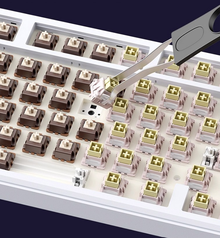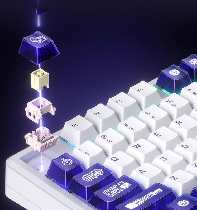 디자인 콘셉트는 약간 우주 테마 느낌도 있고, 투명 키캡과 컬러 포인트가 어우러져 레트로하면서도 미래적인 인상을 줍니다.